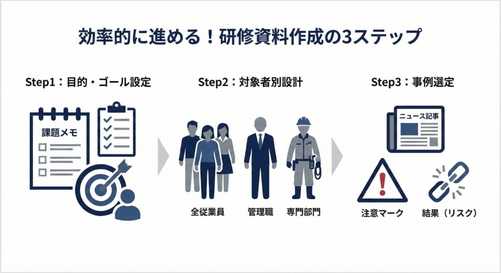 対象を絞ることで、受講者の当事者意識を高め、現場での「うっかり違反」を未然に防ぎます。